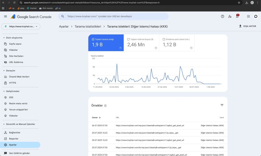 Troy Hair’in SEO performansını etkileyen en kritik sorunlardan biri, Google botlarının olmayan URL’lere gereksiz tarama istekleri göndermesiydi. Özellikle URL sonuna site adresinin tekrar eklenmesi gibi yapısal hatalar nedeniyle Google, olmayan sayfalar için tarama bütçesi harcıyor ve botların ciddi zaman kaybetmesine sebep oluyordu.