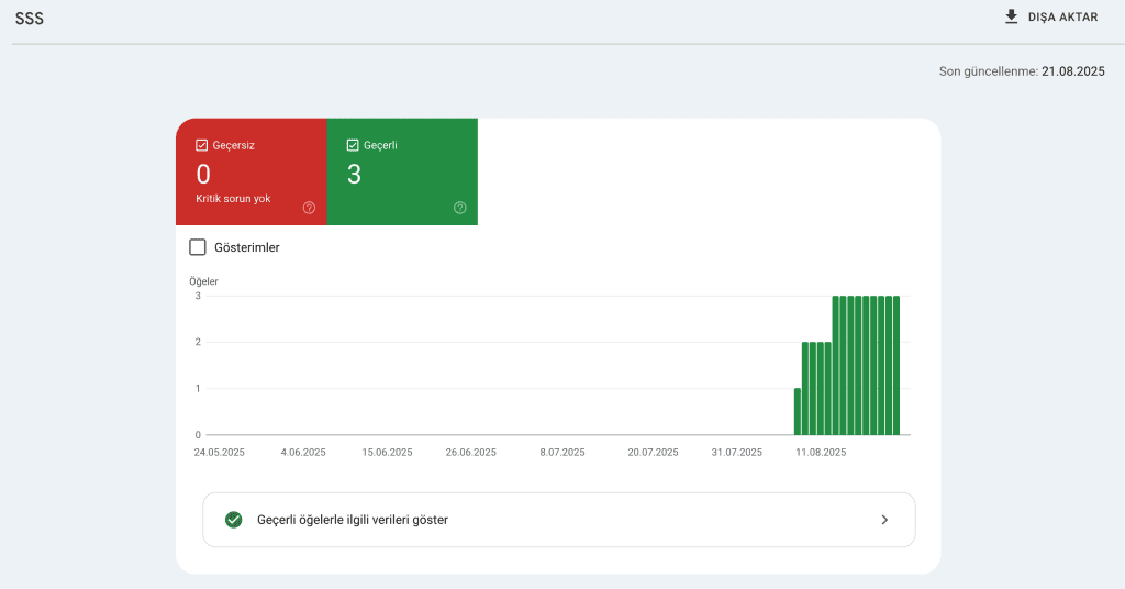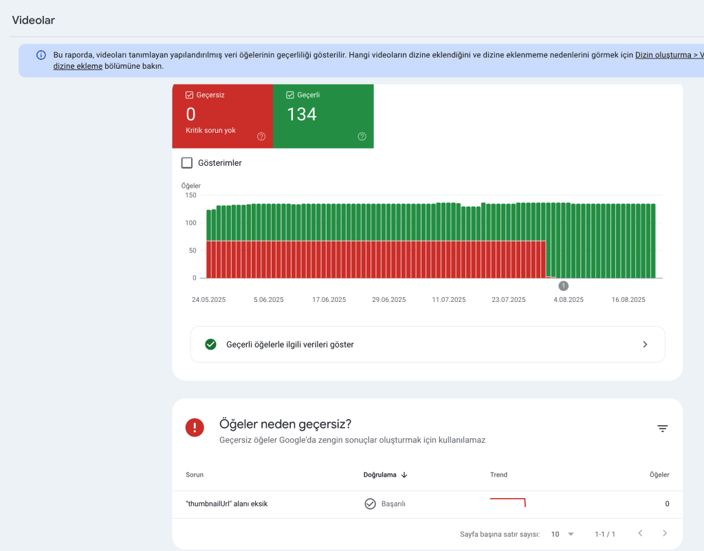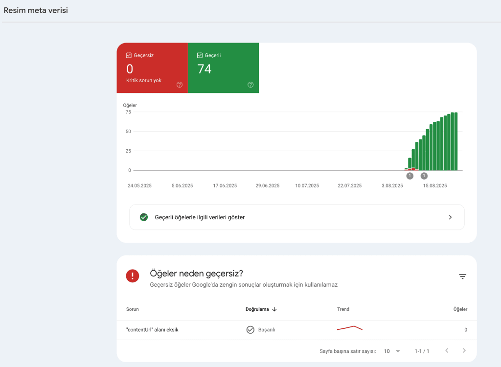 Tüm bu düzenlemelerin ardından Google tarafında doğrulamalar onaylandı ve Search Console’da kayıtlı tüm hatalar sadece birkaç gün içerisinde tamamen giderildi. Önceden kırmızı görünen hatalı URL’ler artık yeşil durumuna geçti.